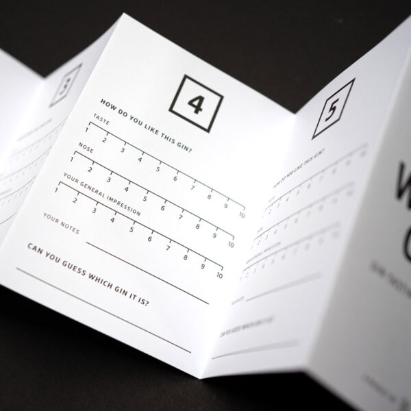 Each tasting box includes tasting notes by the professional spirit sommelier Paul Thill and a record card that allows you to make your own notes. After having blind tasted the different gins, you can guess which gin is in which bottle. By peeling off the cover labels, you will discover the right answer.
